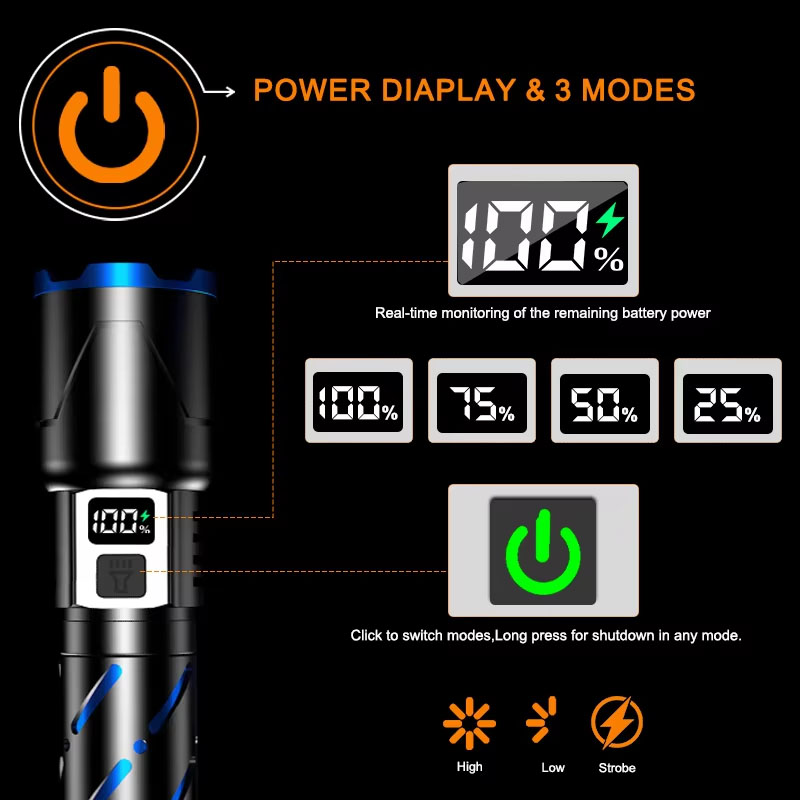 New High Power Long Distance Fluorescent Film Power Indicator Rechargeable LED Tactical Flashlights