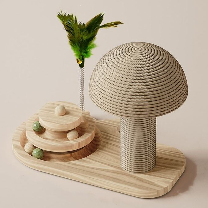 New Design Cat Scratching Post 3-in-1 Mushroom Cat Scratcher With Interactive Trackballs Stable Wooden Base for Indoor Cats