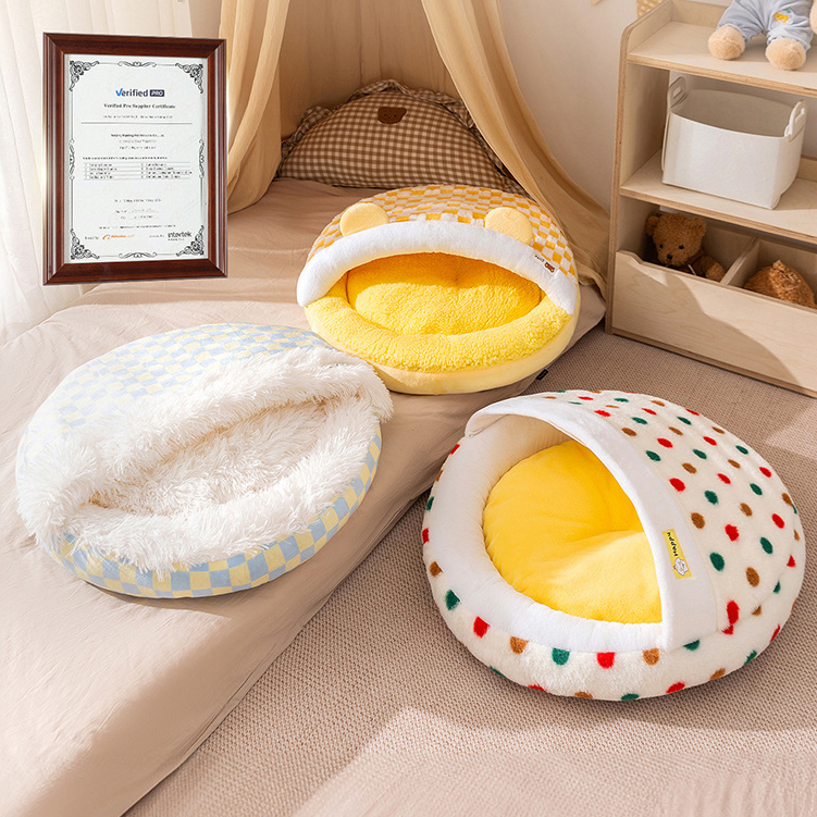 Pet Cat Dog Cave Bed House Foldable Fleece Cute Design Arctic Velvet Fabric Pet Cave Cat House with Mat Plush Pet Bed Indoor