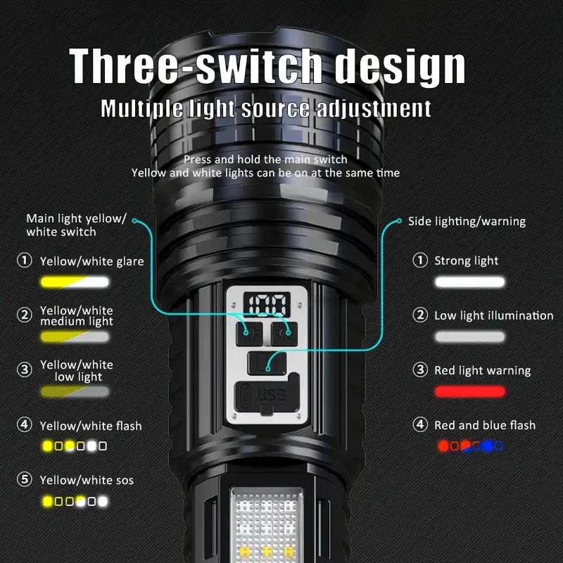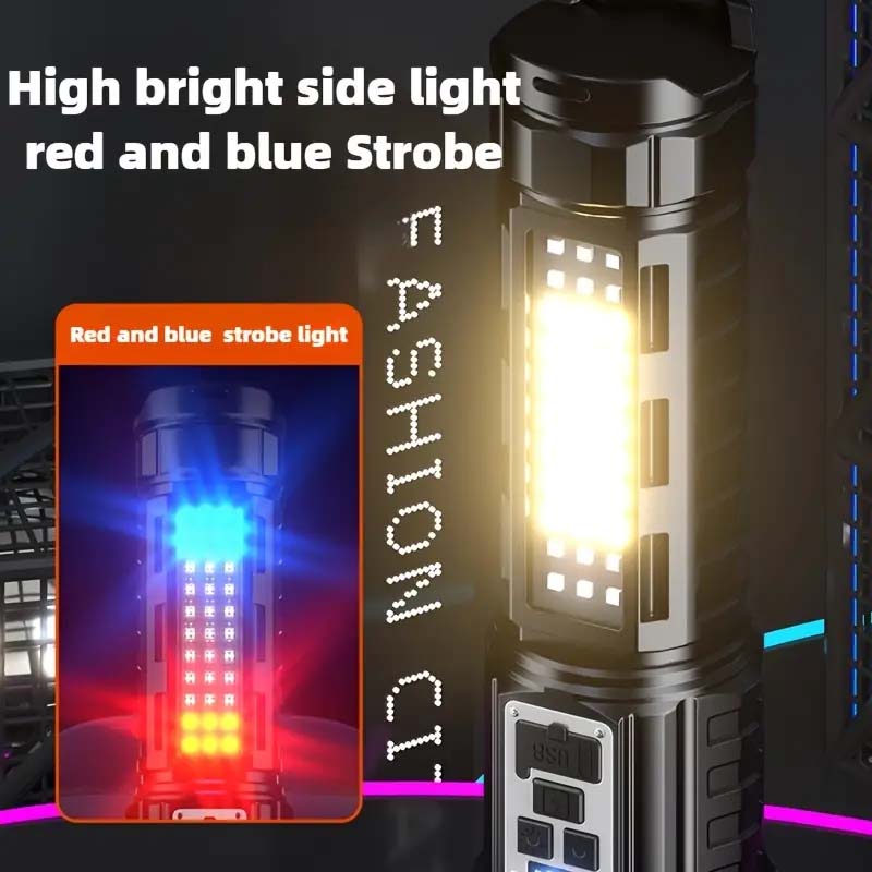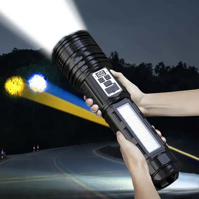 Long Range Red Blue Side Light Digital Power Display USB Rechargeable Zoomable Power Bank Camping Tactical Flashlight