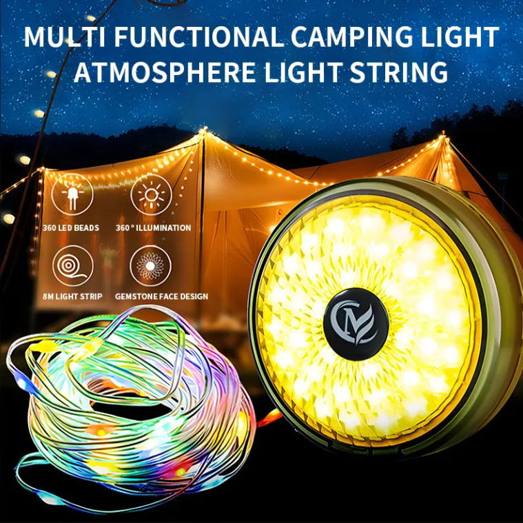Portable Waterproof LED Camping String Light 2-in-1 Rechargeable for Hiking Courtyard Tent Decorations