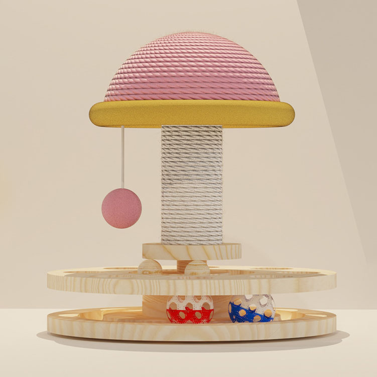 New Design Cat Scratching Post 3-in-1 Mushroom Cat Scratcher With Interactive Trackballs Stable Wooden Base for Indoor Cats