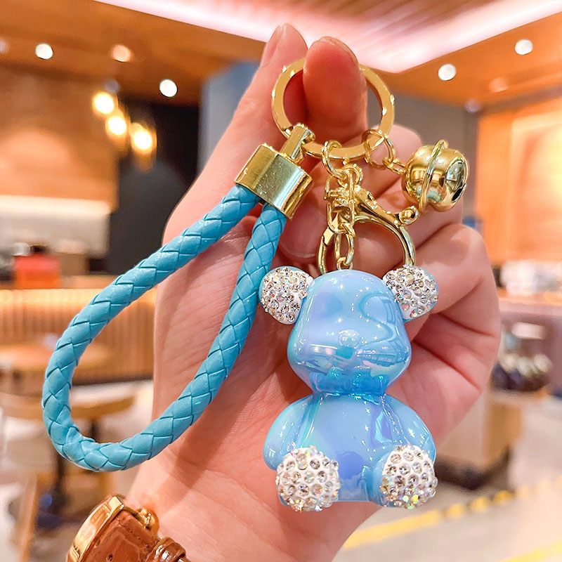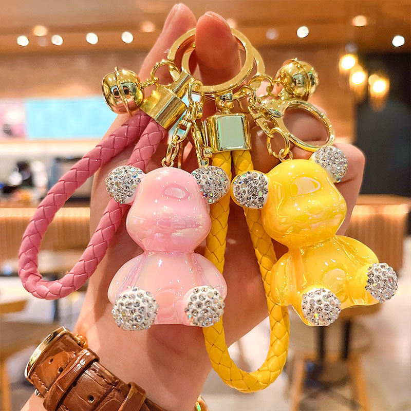 Candy Color Teddy Bear Keychain Rhinestone Bears Doll Key Chains Leather Wristlet Bag Pendant Cute Keychain